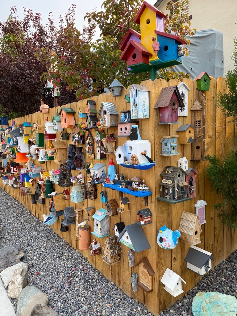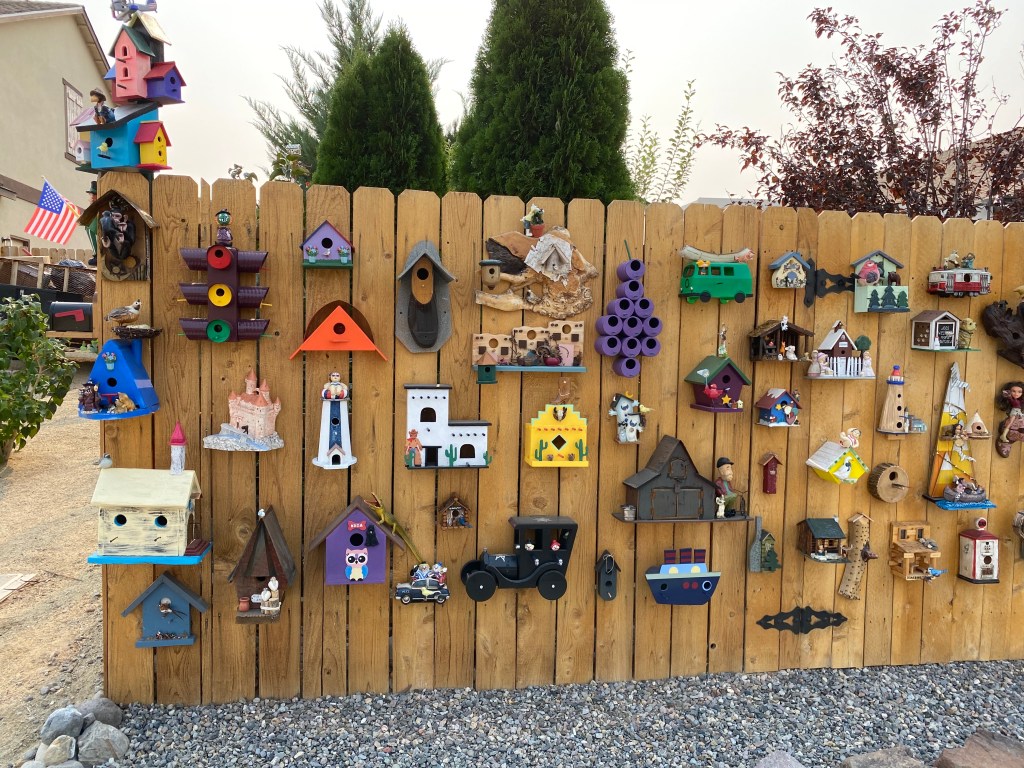 On a beautiful fall evening, my wife asked if I would like to join her and our three children for a bike ride nearby our house–she had seen a really fun collection of bird houses on display on someone’s fence. I’m so glad she took us. There is a bird house for nearly everyone to celebrate Halloween, the community, hunters, farmers, cowboys… you get the idea. I tried to take a picture of all of them–some were my kids favorite, or just stood out to me in such a unique way.