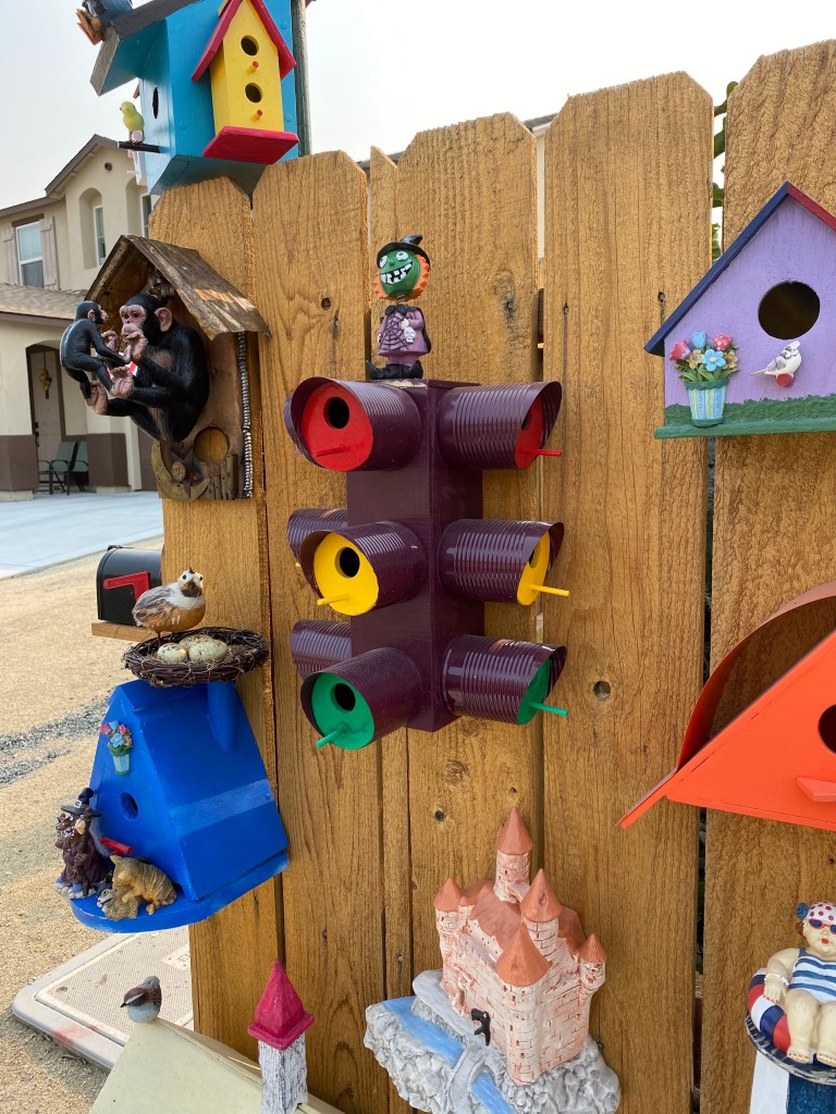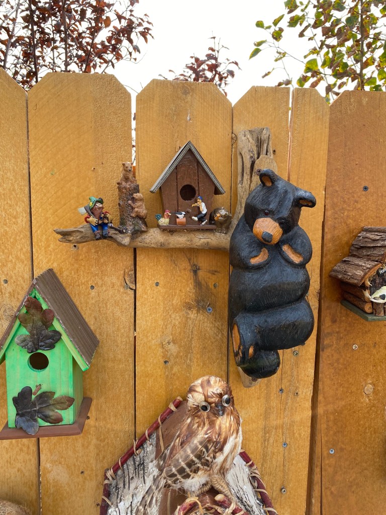 He shared how he heard a neighbor girl walk by telling her mom how much she loved the Pinocchio bird house, because “Pinocchio is my favorite!” He loves to make them for people to see, he doesn’t sell them, just wants to share his talent for everyone who wants to see it.