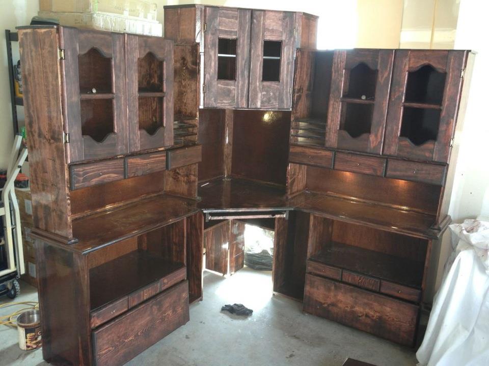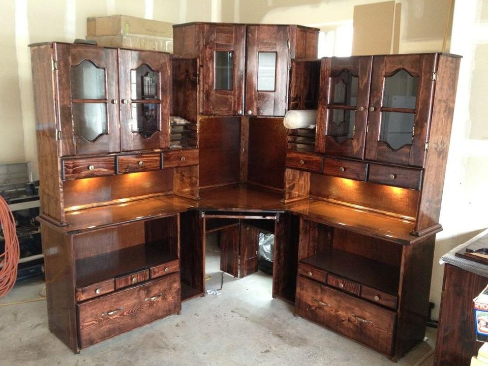 This big guy was built as a corner computer hutch/desk. I came up with the design thanks to an executive set that my father-in-law owns. I modified his design to allow for a corner setup. The wood choices again came from a thrift mentality. I actually used MDF wood that I had used on another desk that I ended up not liking. The MDF is used as paneling inside of a pine frame. It’s a cheaper option and a very common board. For the drawer fronts I used pine again, and the same for the window pane frames.