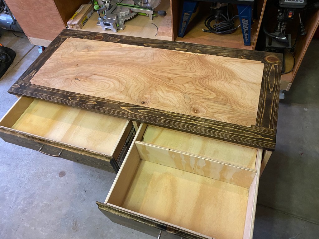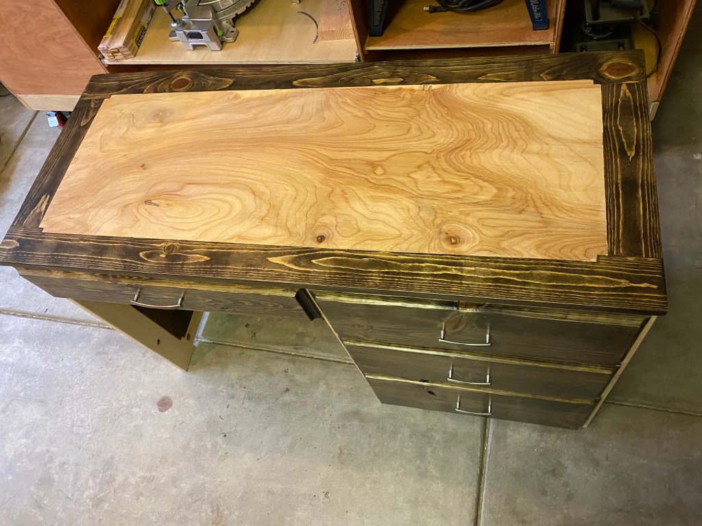It is actually built around a lot of the same principles as the other two I’ve already talked about. This time instead of using an MDF panel wood, I used plywood with a pine frame. From the beginning of this project I wanted to try doing a two-tone. I just loved to color and pattern of the plywood and had to leave it so that it would stand out on the desk top. It is actually my favorite part.