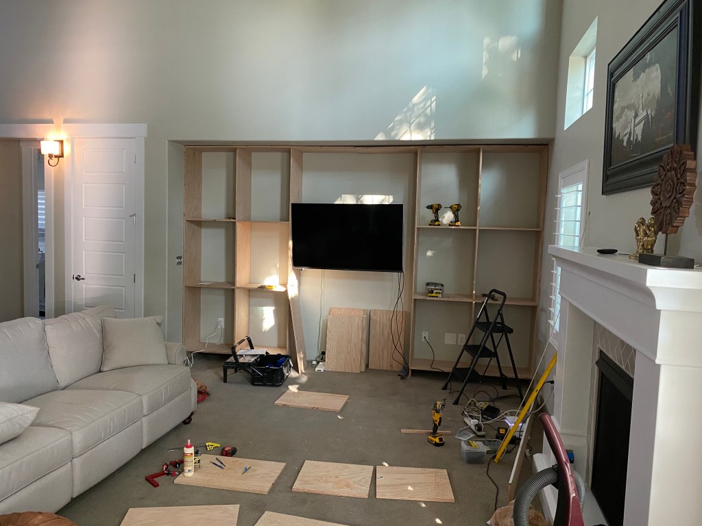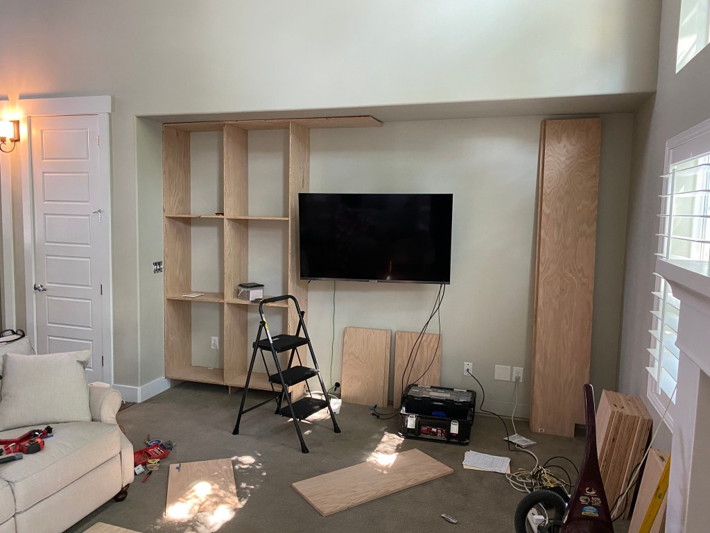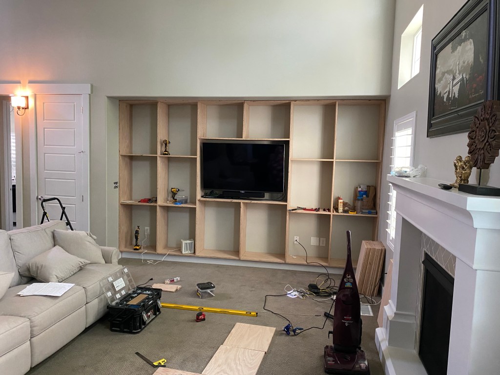 As you follow the profession of the photos, you can perhaps see that I built this on the carpet (it was less of a hassle anyway–I was happy not to have to cut the carpet, it’s not my favorite job). I ended up taking the baseboard off the back wall to use as my recessed kick plate. I built the shelves in really two sections. The left and right sections mirror each other. The middle and third section isn’t really built into a separate section. The shelves and supports were mostly added to the left and right sections. I ran a power cord behind the wall to a surge protector under the middle section. Both bottom panels in the middle section are floating so that you can remove them to access the surge protector. You can also see in the progression that each side has three sections; the two shelves between the top and bottom are permanent shelves, while the three other shelves are adjustable. You may also be able to see that the light switch cover plate had to be trimmed a little to fit in the depth of the shelf.